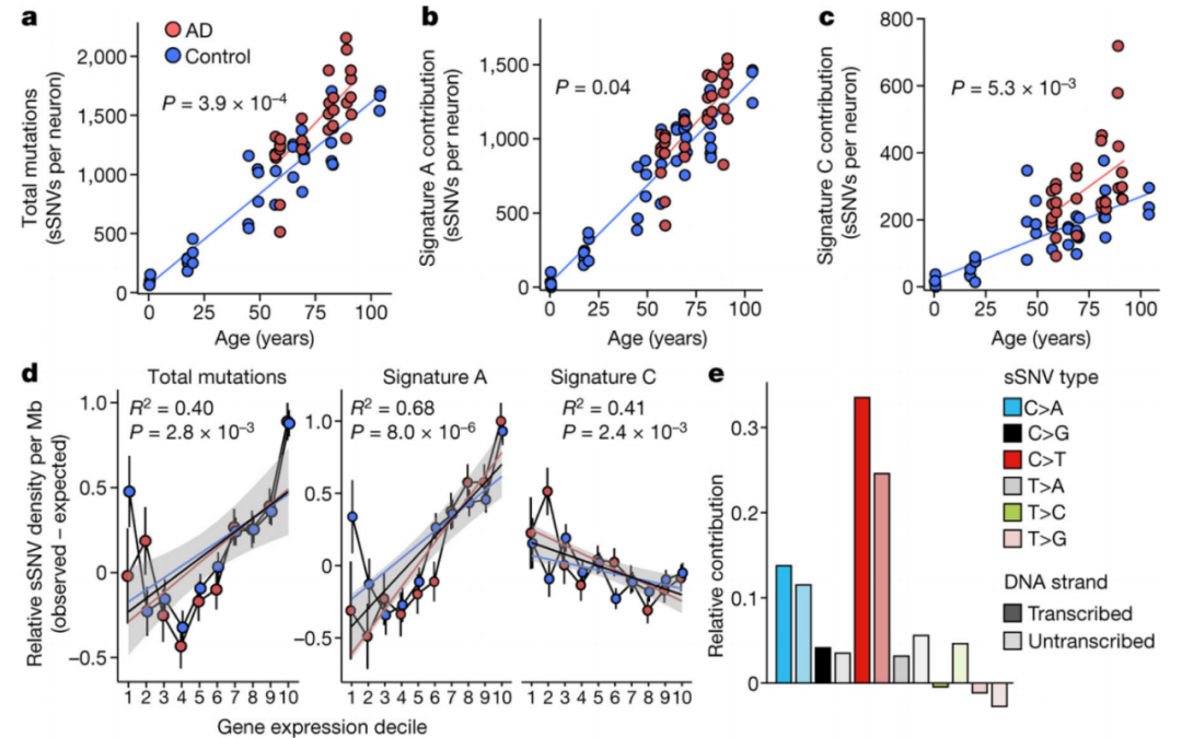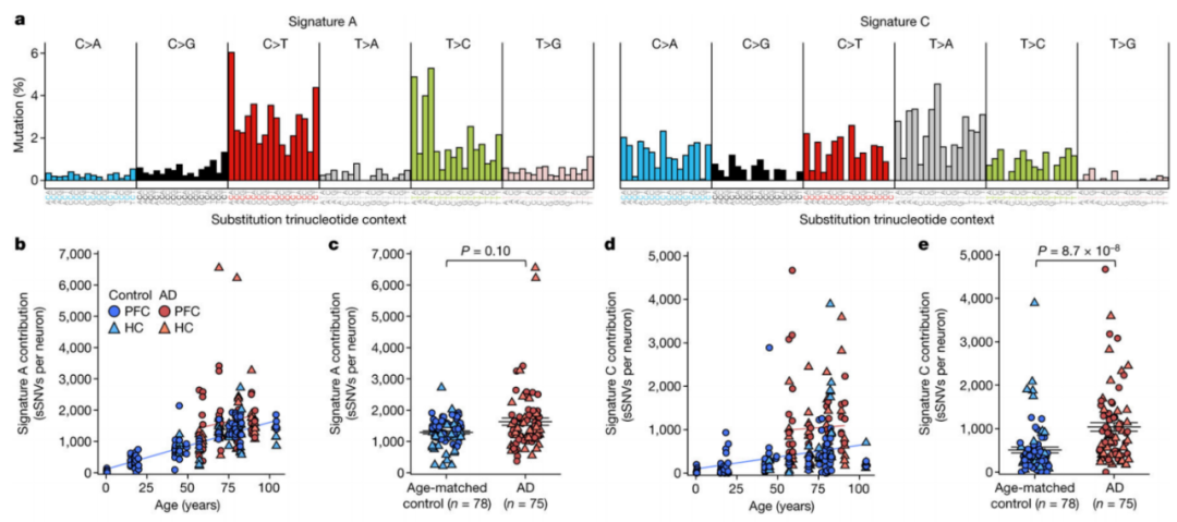 對(duì)從AD和神經(jīng)典型對(duì)照個(gè)體的大腦中分離出來(lái)的神經(jīng)元進(jìn)行了單細(xì)胞全基因組測(cè)序(scWGS),染色了泛神經(jīng)元標(biāo)記NeuN來(lái)標(biāo)記神經(jīng)元,并進(jìn)一步只標(biāo)記了大的NeuN陽(yáng)性核,使用多位移放大(MDA)進(jìn)行全基因組擴(kuò)增,分析了8例AD的91個(gè)神經(jīng)元和18個(gè)神經(jīng)典型對(duì)照組的159個(gè)神經(jīng)元。在神經(jīng)典型個(gè)體中,神經(jīng)元sSNVs隨著年齡的增長(zhǎng)而增加,sSNVs的年增長(zhǎng)率相當(dāng)高,從每年13到55個(gè)sSNV不等,在一些特殊細(xì)胞類型中,分裂突變率更高。沒(méi)有神經(jīng)診斷的個(gè)體的海馬CA1神經(jīng)元顯示,隨著年齡的增長(zhǎng),sSNVs呈積累的趨勢(shì),這與神經(jīng)典型對(duì)照個(gè)體前額葉皮層(PFC)神經(jīng)元中看到的sSNV的增加沒(méi)有顯著差異。