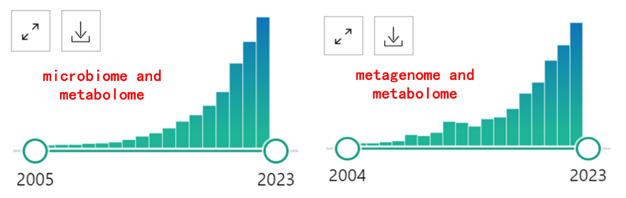 而近年來,關(guān)鍵詞“microbiome and metabolome”、“metagenome and metabolome”也是逐漸備受關(guān)注的熱點(diǎn)話題,PubMed搜索發(fā)文量也是逐年上升的趨勢(shì)。