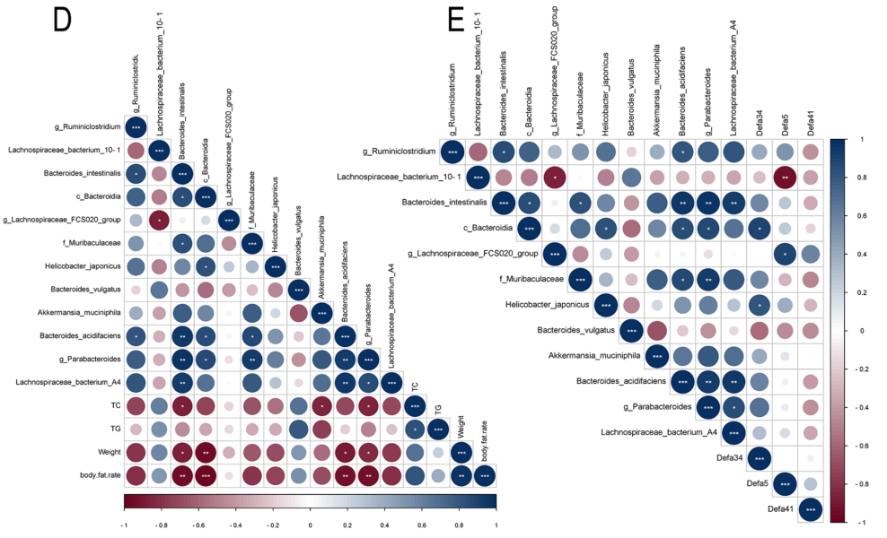 EA促進了腸粘膜免疫中3個代表性基因Defa5、Defa20和Defa41的表達,其中Defa5顯著上調(diào)(圖6A);EA還恢復了這些防御素的蛋白質(zhì)水平,其中Defa5和Defa41顯著增加(圖6B)。斯皮爾曼相關(guān)系數(shù)分析結(jié)果顯示,Defa5和Defa34的蛋白質(zhì)水平與關(guān)鍵肥胖指數(shù)呈負相關(guān),包括體重、體脂百分比以及甘油三酯TG、總膽固醇TC含量(圖6C);,EA下調(diào) Lachnospiraceae bacterium_10_1和 Bacteroides acidifaciens物種的相對豐度,與肥胖小鼠的關(guān)鍵肥胖指數(shù)呈正相關(guān)(圖6D);EA調(diào)節(jié)的腸道防御素表達與幾種腸道菌群相關(guān)(圖6E)。以上結(jié)果表明,腸道防御素的調(diào)節(jié)是EA拯救肥胖小鼠腸道微生物群的關(guān)鍵機制之一。