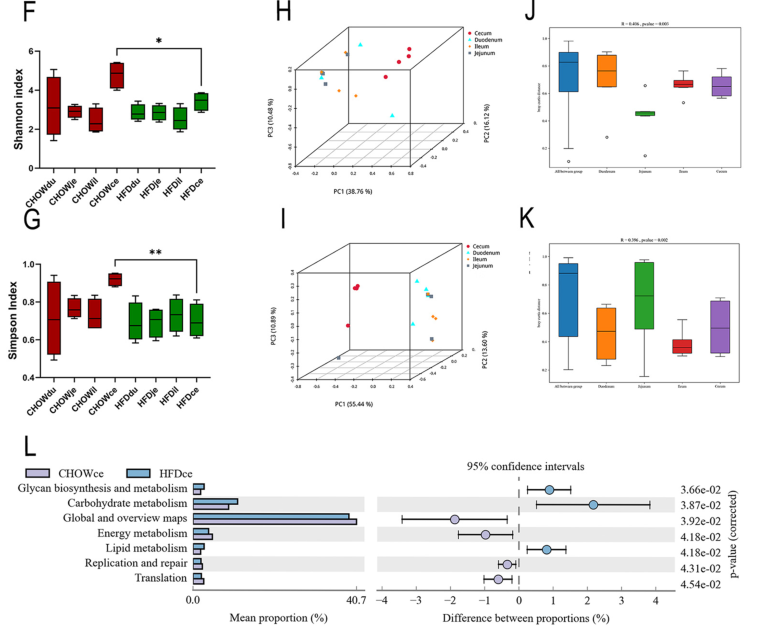 α多樣性分析結(jié)果顯示,高脂飲食HFD組與正常對照組的十二指腸、空腸和回腸微生物多樣性沒有顯著差異,但在盲腸中HFD組微生物多樣性顯著減少(圖1F, 1G);β多樣性分析結(jié)果顯示,與其他腸道段相比,只有盲腸微生物菌群在HFD組與正常對照組表現(xiàn)出顯著差異(圖1H, 1I);此外,top 15的KEGG通路中有7個是基于微生物功能富集,高脂飲食組盲腸微生物的上調(diào)通路包括脂質(zhì)代謝、碳水化合物代謝和聚糖生物合成和代謝,下調(diào)通路包括能量代謝相關(guān)途徑(圖1L)。