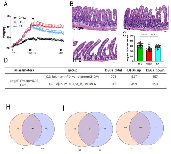 相較于HFD組,EA組顯示出顯著地減肥效果(圖2A),并減少了附睪、腎臟和腹股溝區(qū)域的脂肪堆積??漳c是腸道脂質(zhì)消化和吸收的主要區(qū)域,HFD小鼠的空腸絨毛明顯長于食物組(圖2B, 2C)。HFD組和正常對照組間共鑒定出994個差異表達基因DEG(圖2D-F),HFD組和EA組共鑒定出849個DEG(圖2G);通過取兩個比較組共有的DEG,作為EA直接調(diào)控肥胖的DEG,共檢測到共有基因299個,其中上調(diào)的有165個,下調(diào)的有133個(圖2H-J)。