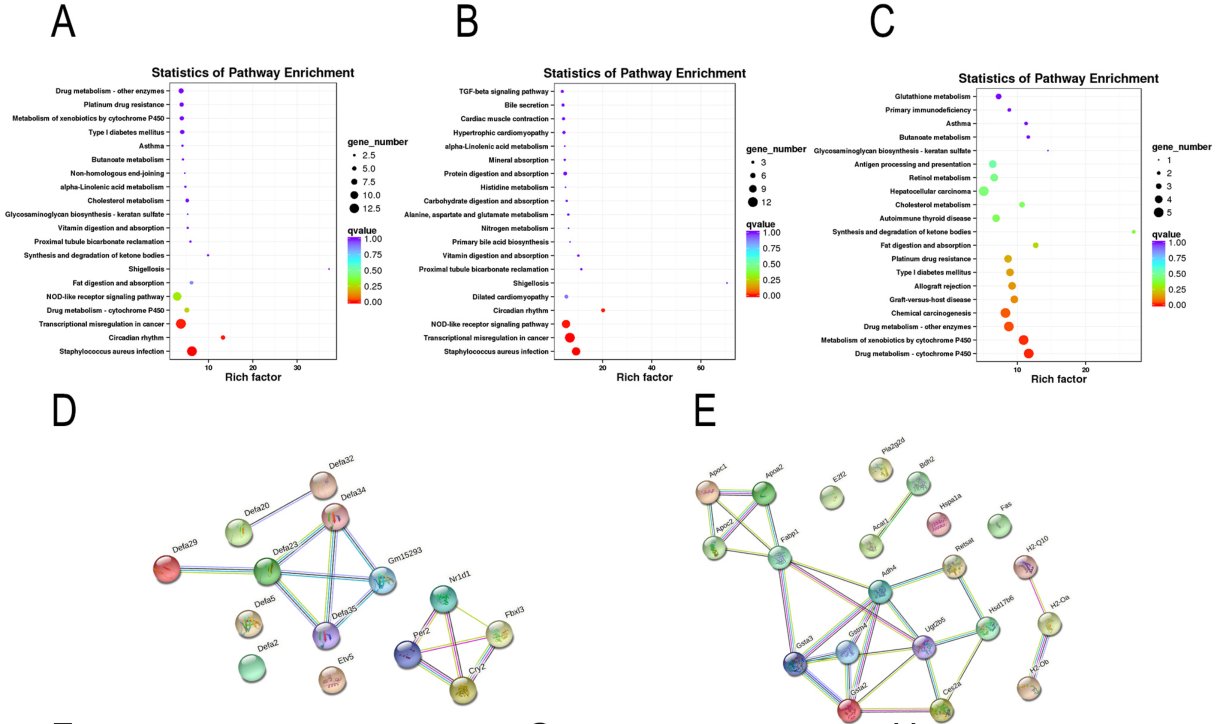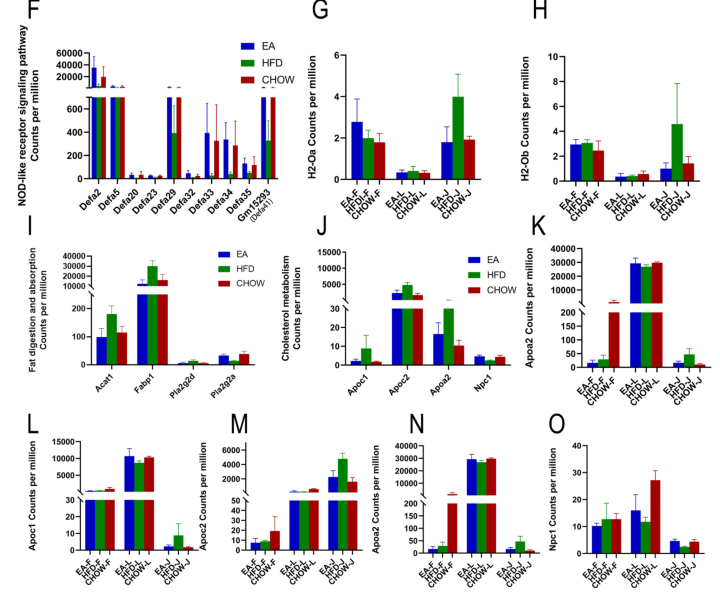 對共有DEG進行功能富集分析,發(fā)現(xiàn)顯著富集的通路主要與宿主先天防御和脂質(zhì)代謝相關(guān)(圖3A);在去除功能未鑒定的基因或lncRNA后,獲得140個上調(diào)和92個下調(diào)的DEG也進行功能富集分析(圖3B, 3C);然后,對top20通路的DEG進行PPI調(diào)控網(wǎng)絡分析(圖3 D, 3E),結(jié)果顯示,EA主要上調(diào)的通路包括α防御素基因在內(nèi)的NOD樣受體信號通路(圖3 D),下調(diào)的通路脂質(zhì)代謝(包括脂質(zhì)消化和吸收途徑),以及免疫應答相關(guān)通路(谷胱甘肽s-轉(zhuǎn)移酶和MHC II類相關(guān)基因)(圖3E)?;虮磉_直方圖顯示EA干預恢復大量異常表達的DEG,與腸粘膜免疫相關(guān)的DEG,如α防御素基因,可以通過EA顯著恢復(圖3F);與免疫反應相關(guān)的H2-Ob和H2-OA僅在空腸區(qū)域下調(diào)(圖3G, 3H);EA干預恢復了fabp1、pla2g2d和acat1的表達水平,主要負責脂肪消化和吸收(圖3I);最后,EA干預通過下調(diào)apoc1、apoa2和apoc2以及上調(diào)npc1來調(diào)節(jié)膽固醇代謝(圖3J-O)。