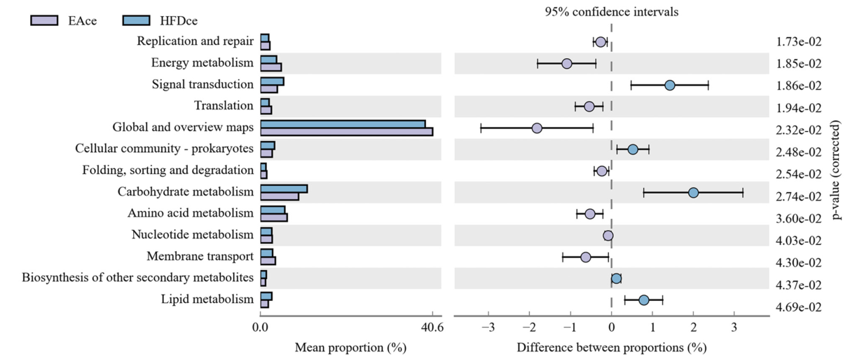 在EA干預21天后,HFD組中盲腸微生物組成被顯著恢復(圖4 A&B),α多樣性(圖4 C, 4D)和β多樣性恢復(圖4E-G);通過LEfSe分析鑒定了9種特征細菌(圖4H);跟蹤EA處理3、7、14和21 d相對豐度的時間序列變化,篩選到肥胖小鼠盲腸10個相關(guān)物種,其中8個上調(diào),包括G. Ruminiclostridium和 A. muciniphila;Tax4Fun預測了EA和HFD組間具有顯著差異的13種KEGG通路;并且,EA干預能有效地下調(diào)脂質(zhì)代謝途徑,上調(diào)能量代謝途徑(圖5)。
