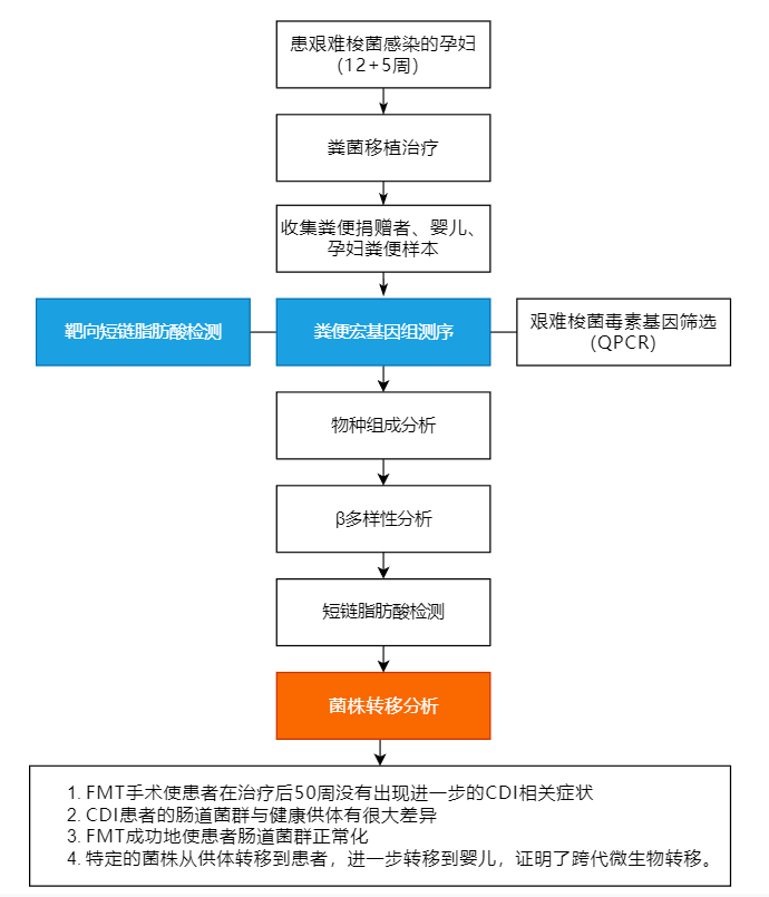 該研究通過對糞便捐獻(xiàn)者、孕婦和嬰兒的糞便樣本進(jìn)行宏基因組測序和菌株水平分析,并進(jìn)一步與收集的651名健康嬰兒和58名健康成年人的宏基因組樣本進(jìn)行比較,發(fā)現(xiàn)一些特定的菌株從捐贈者轉(zhuǎn)移到患者身上,然后轉(zhuǎn)移到嬰兒,證明了跨代微生物轉(zhuǎn)移。