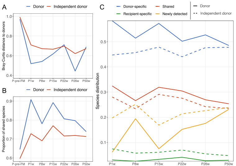 研究者進(jìn)一步將患者 FMT 后腸道微生物群分為四類,即共有的、供體特異性的、受體特異性的和新檢測到的(圖2C)。結(jié)果表明,供體特定物種的百分比高,在第 1 周占 58.3%,并且在研究期間大致保持穩(wěn)定。相比之下,當(dāng)在這些分析中使用獨立供體代替實際供體時,供體特定和共享物種的比例在所有采樣時間點都較低。此外,在 FMT 后跟蹤了轉(zhuǎn)移的供體特異性物種,發(fā)現(xiàn)其中超過 80% 的物種可以成功轉(zhuǎn)移并維持到 50 周,遠(yuǎn)高于獨立捐贈者。由于供體特異性物種的轉(zhuǎn)移,根據(jù) BrayCurtis 相異性,F(xiàn)MT 后患者的腸道菌群組成與基線時(P-FMT 前)不同。盡管供體特異性物種在數(shù)量上所占比例大,但它們的豐度很低,并且主要來自擬桿菌科、毛螺菌科、梭菌科和瘤胃球菌科。因為豐度高的物種同時存在于供體和 preFMT 樣本中,無法檢測到細(xì)菌在物種水平上的轉(zhuǎn)移;因此,有必要對微生物轉(zhuǎn)移進(jìn)行更深入的研究。