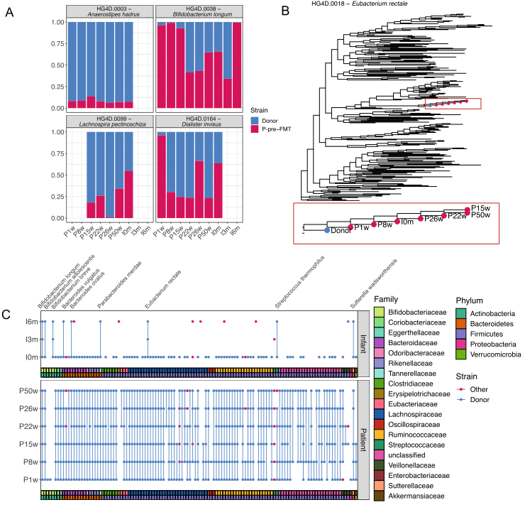當(dāng)觀察相同等位基因的百分比時,鑒定出120個不同物種的菌株轉(zhuǎn)移,這接近捐贈者樣本中檢測到的所有物種(241個)的一半。在這120種細(xì)菌中,有116種在一個或多個患者樣本中也被檢測到,其中99%(115/116種)從供者向患者轉(zhuǎn)移了菌株(圖3C)。此外,我們在一個或多個患者樣本中觀察到14個物種的替代菌株。在嬰兒樣本中,檢測到87個不同的物種,并在其中92%(80個物種)發(fā)現(xiàn)了供體菌株植入。然而,在這80種細(xì)菌中,87.5%(70種)只在胎糞樣本中發(fā)現(xiàn),在嬰兒以后的時間點在腸道中檢測到的供體菌株要少得多(3月樣本中3.8%[3/80],6月嬰兒樣本中12.5%[10/80])。有趣的是,當(dāng)同一物種的菌株在治療后在母親體內(nèi)共存時,兩種菌株也會轉(zhuǎn)移給嬰兒。