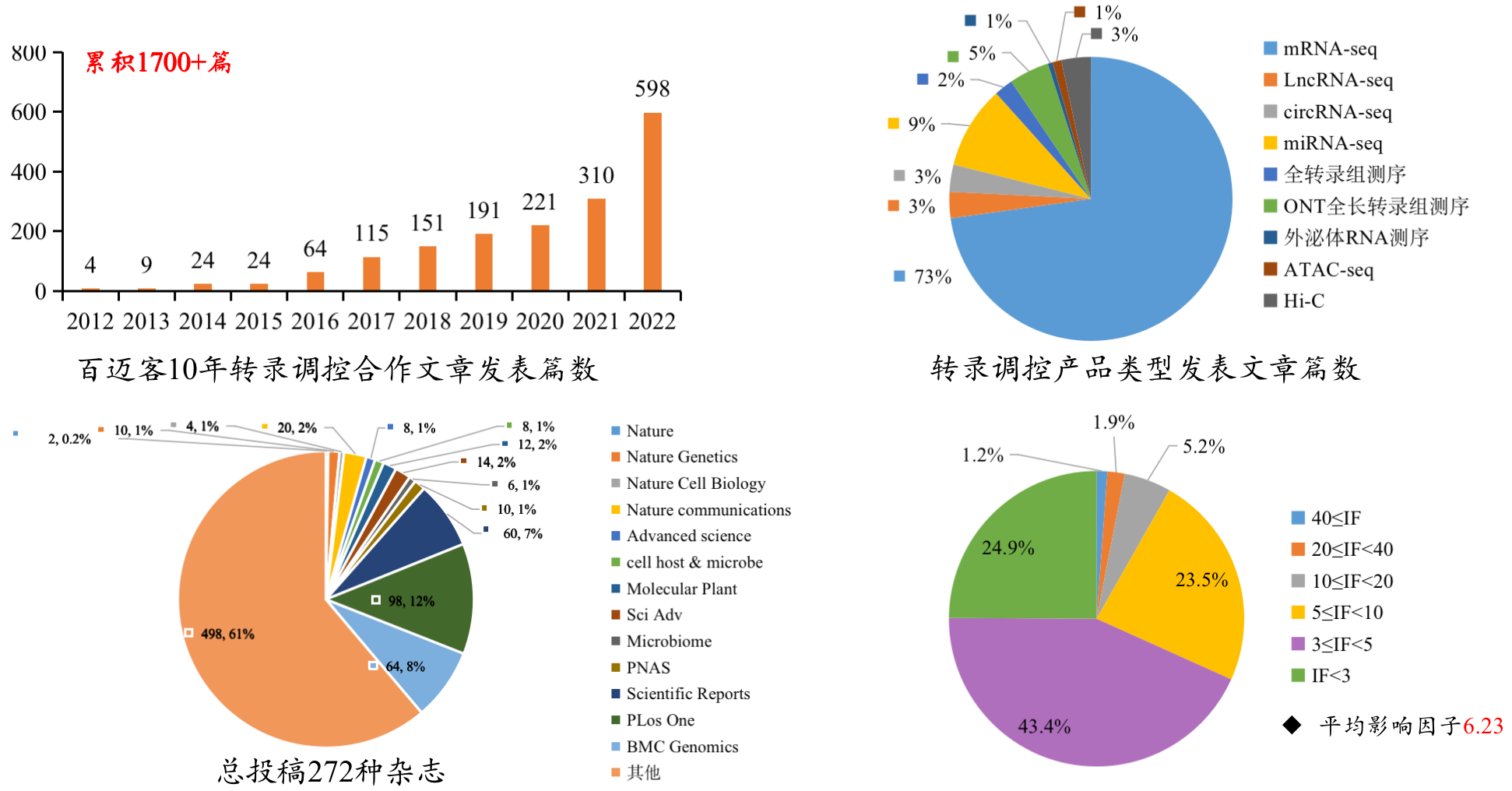 百邁客轉錄調控合作項目文章持續(xù)爆發(fā)增長,累積1700篇,2022年度收錄598篇,總IF高達3500+,平均影響因子6.23。