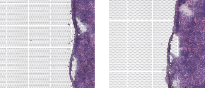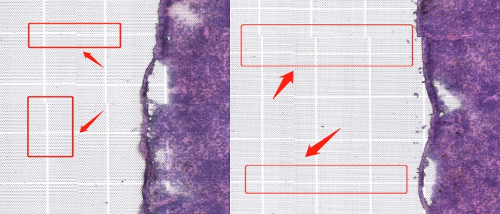 掃描顯微鏡產出的結果,是對片子各區(qū)域拍照后拼接而來的,部分型號的顯微鏡由于參數(shù)問題在拼接過程中可能會產生“拼接錯誤”。一般情況下,拼接錯誤的誤差在5~10μm左右。如果分析的分辨率較高時,存在“拼接錯誤”的圖像則會和實際位置產生錯位,進而影響到數(shù)據(jù)分析。
