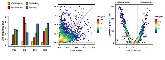 將4種方法的數(shù)據(jù)整合分析,共鑒定了13個(gè)細(xì)胞簇,包括足細(xì)胞,內(nèi)皮細(xì)胞和腎小球膜細(xì)胞;3種snRNA-seq 檢測(cè)足細(xì)胞,內(nèi)皮細(xì)胞和閏細(xì)胞的靈敏度更高;但是scRNA-seq未檢測(cè)到任何足細(xì)胞。差異基因表達(dá)分析顯示,?71.4%?基因在細(xì)胞和細(xì)胞核中都被檢測(cè)到;在檢測(cè)到的基因中,僅僅?5.0%?在細(xì)胞中的表達(dá)量高于細(xì)胞核,6.4%的基因在細(xì)胞核中的表達(dá)量高于細(xì)胞(fold change>1.5,?P value <0.05)(圖3-2);scRNA-seq高表達(dá)基因包括線粒體、核糖體基因和熱休克途徑中的基因;snRNA-seq高表達(dá)基因包括溶質(zhì)載體、轉(zhuǎn)錄因子和Non-coding?RNA基因。