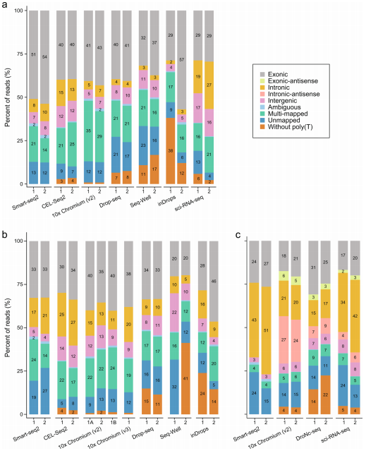 b.?reads結(jié)構(gòu)和比對(duì)到基因組的信息顯示不同方法具有效率差異結(jié)果顯示,不同的方法在預(yù)期的位置沒(méi)有Poly(T)reads比例明顯不同;外顯子、內(nèi)含子、基因間、重疊的差異基因、多重比對(duì)以及無(wú)法比對(duì)的reads不同方法間基本一致;但是細(xì)胞核中內(nèi)含子reads與外顯子reads的比率明顯高于細(xì)胞,因?yàn)榧?xì)胞核中有較高比例未剪切的轉(zhuǎn)錄本(圖2-2)。