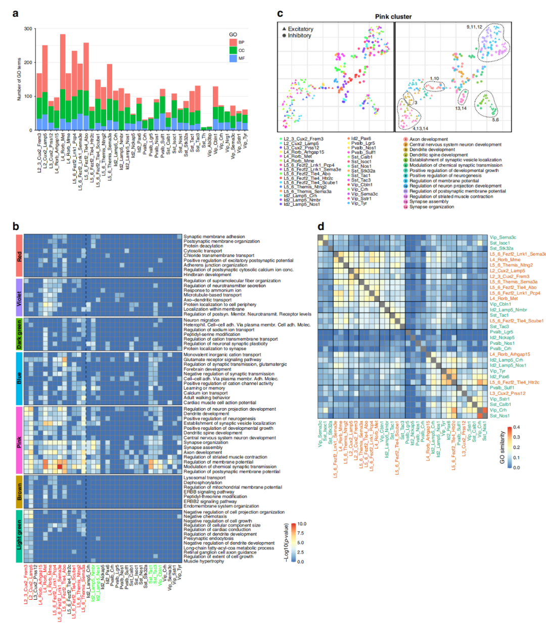 作者計算了每種已鑒定亞型GO中DE基因的富集程度,一些神經(jīng)元亞型在癲癇中表現(xiàn)出了大的轉(zhuǎn)錄組改變(>100豐富的GO),但多數(shù)神經(jīng)元亞型中只有少數(shù)GO,特別是對于生物過程(BP)來說,這應(yīng)該與通路的生物學(xué)功能相關(guān)(圖2a)。這些受影響較小的亞型中,大多數(shù)在癲癇細(xì)胞和非癲癇細(xì)胞之間也具有高的基因表達(dá)相關(guān)性(圖1d),從而證實(shí)癲癇和非癲癇之間轉(zhuǎn)錄組相關(guān)性高的亞型中,癲癇改變的信號通路也較少。
