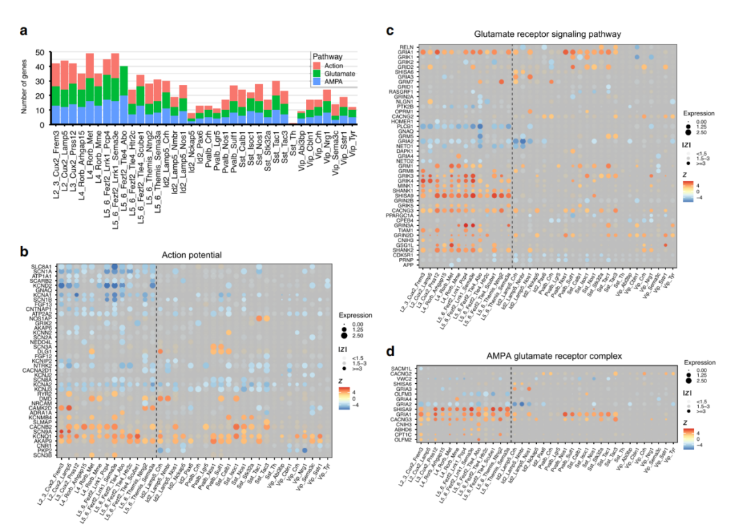 谷氨酸受體,尤其是AMPA受體被證明是癲癇發(fā)作的主要驅(qū)動力之一,在篩選出缺乏表達(dá)的基因后,尋找富含與奮性相關(guān)轉(zhuǎn)錄組學(xué)變化的亞型,并從這些GO項中繪制DE基因(圖3a–d)。CKAMP44是貫穿整個顳葉皮質(zhì)的主要AMPA受體輔助亞基,這一事實(shí)也強(qiáng)調(diào)了CKAMP44上調(diào)的重要性(圖3c, d)。癲癇對AMPA受體輔助亞基編碼基因的上調(diào)有相當(dāng)普遍的影響。