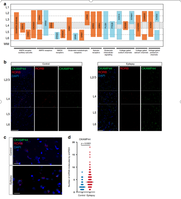 癲癇患者皮層谷氨酸介導(dǎo)興奮相關(guān)基因顯著分層上調(diào)或下調(diào)。作者用單分子熒光原位雜交(smFISH)方法標(biāo)記了幾個高度調(diào)控基因的mRNA。如上所述,在主要神經(jīng)元的亞型中,編碼AMPA輔助亞基的許多基因分層上調(diào)。因此,在一組癲癇和非癲癇樣本的皮質(zhì)切片中標(biāo)記了CKAMP44 mRNA,通過與Rorb和DAPI共標(biāo)記,并確定了L2/3、L4和L5/6的位置(圖4b)。重要的是,證實(shí)了各層中CKAMP44的表達(dá)顯著上調(diào)(圖4b)。