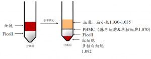 外周血單核細(xì)胞(Peripheral blood monoculear cell, PBMC)中大部分都是淋巴細(xì)胞(包括B細(xì)胞和T細(xì)胞),以及少部分的自然殺傷細(xì)胞和單核細(xì)胞,而紅細(xì)胞和血小板沒(méi)有細(xì)胞核,而粒細(xì)胞(granulocytes) 包括中性粒細(xì)胞、嗜堿性粒細(xì)胞和嗜酸性粒細(xì)胞,有多葉核,所以不包括在PBMC中。PBMC的制備采用密度梯度離心法,可通過(guò)Ficoll作為密度梯度介,使得不同密度的細(xì)胞在對(duì)應(yīng)的界面處,然后通過(guò)快速離心,實(shí)現(xiàn)細(xì)胞分離。