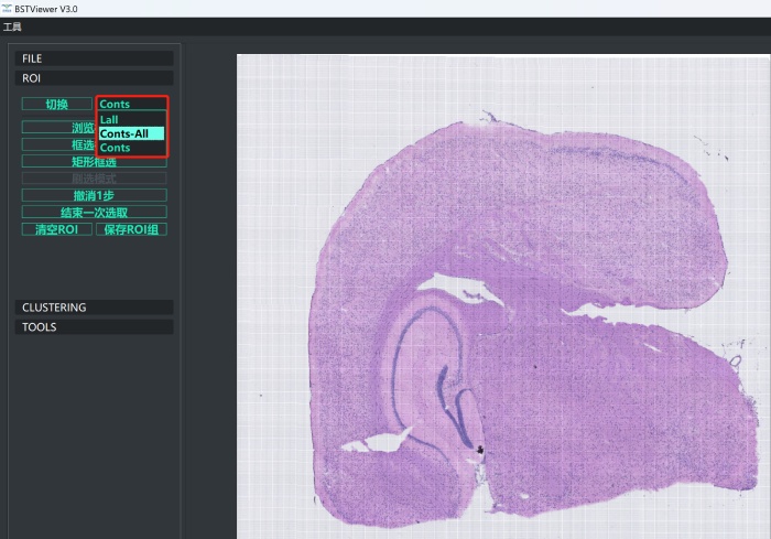 4)進(jìn)行ROI 創(chuàng)建。點(diǎn)擊“ROI”按鈕,此處可以選擇全局聚類和部分區(qū)域聚類。cont和conts-all分別代表在全局下聚類與全局扣除空白區(qū)域聚類。區(qū)域聚類的話目前提供了“框選模式”和“矩形框選”兩種模式。框選合適的區(qū)域后點(diǎn)擊“結(jié)束一次選取”,選擇“保存或摳除”,完成之后點(diǎn)擊“保存ROI組”并命名即可;