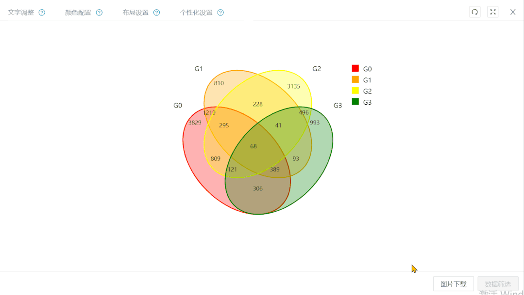 通常會對差異的基因/物質(zhì)做簡單的韋恩圖繪制,也可以對總體的基因/物質(zhì)進行繪圖。交互韋恩圖的功能非常靈活,2-5個分組自動繪制韋恩圖,5-32個自動為花瓣圖,支持經(jīng)典韋恩圖、齒輪圖的更換,還支持?jǐn)?shù)字點擊進行下級數(shù)據(jù)的二次篩選交互。