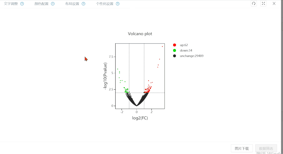 火山圖(Volcano Plot)可以快速地查看基因/物質(zhì)在兩個(組)樣品中表達(dá)水平的差異?;鹕綀D的交互式支持自定義展示一定數(shù)目的重點差異基因,還支持支持選擇重點差異基因進行數(shù)據(jù)篩選,進行二次數(shù)據(jù)處理。