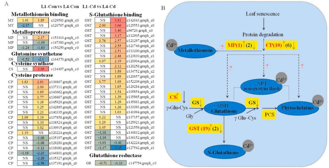 通過比較分析幼葉和衰老葉片對Cd脅迫的響應(yīng),有助于探索衰老葉片中Cd積累的關(guān)鍵調(diào)控基因,作者進(jìn)一步比較了對照組組和Cd處理組在“谷胱甘肽代謝”途徑中的差異基因表達(dá)。谷胱甘肽-S-轉(zhuǎn)移酶(GSTs)是催化GSH-Cd偶聯(lián)的酶,植物GSTs可以進(jìn)行GSH依賴的反應(yīng)來進(jìn)行Cd解毒。在該轉(zhuǎn)錄組中,共鑒定出了26個基因編碼GST。其中,19個上調(diào)基因在Cd脅迫下的差異倍數(shù)高于對照組。結(jié)果表明,GST基因的上調(diào)和S-谷胱甘肽的結(jié)合可能參與了衰老葉片中Cd的積累。