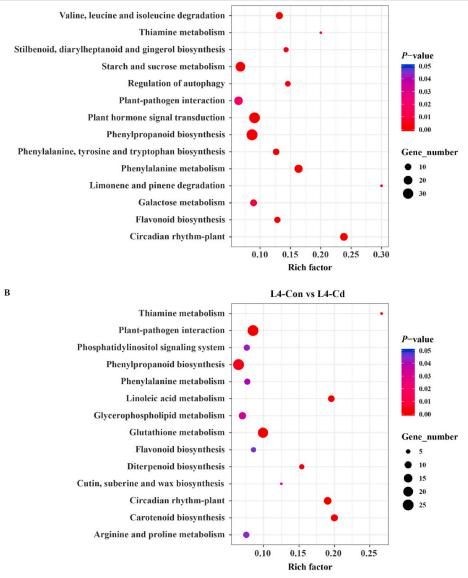 為了了解差異基因的功能,作者進(jìn)行了GO富集分析。四組的差異基因在節(jié)律過程、信號傳導(dǎo)和代謝過程等生物過程中都有20個豐富的分類。值得注意的是,與對照組相比,脫毒組的差異基因在幼葉和衰老葉中都有富集(L1-ConvsL1-Cd和L4-ConvsL4-Cd),但在幼葉和衰老葉的對照組和處理組中沒有明顯富集(L1-CdvsL4-Cd和L1-ConvsL4-Con)。