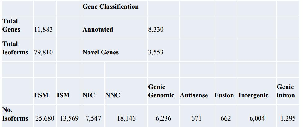 作者獲得了3100萬(wàn)次reads,其中使用Canu對(duì)2200萬(wàn)reads(71%)進(jìn)行了錯(cuò)誤糾正,只關(guān)注全長(zhǎng)reads,通過確定為具有5’引物和poly(A)和3’引物的序列全長(zhǎng)序列。ToFU轉(zhuǎn)錄組結(jié)果包含總共11,883個(gè)基因和79,810個(gè)亞型(表北京百邁客生物科技有限公司1),其中8330個(gè)基因與NCBI注釋基因匹配,而3553個(gè)基因是新的。所有這些都對(duì)應(yīng)于橄欖蠅轉(zhuǎn)錄組在同種型水平上比當(dāng)前NCBI注釋的四倍擴(kuò)增。針對(duì)UniprotSwiss-prot數(shù)據(jù)庫(kù)的預(yù)測(cè)蛋白質(zhì)序列的搜索顯示高比對(duì)的是雙翅目,其次是哺乳類動(dòng)物(圖1B)。盡管鑒定了3553個(gè)新基因,但預(yù)計(jì)只有269個(gè)含有開放閱讀框。與注釋基因相比,超過50%的新基因是單外顯子,其中超過80%的基因是多外顯子并且還包含更高百分比的單同種型基因。且新基因的表達(dá)量要低于已注釋基因。在結(jié)構(gòu)上,SQANTI根據(jù)其剪接點(diǎn)和基因組坐標(biāo)將轉(zhuǎn)錄本分為9類,分別為FSM,ISM,NIC,NNC,基因組基因,反義,融合,基因間區(qū)和基因內(nèi)含子(圖1E)。