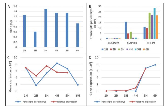 通過將每個(gè)胚胎的每個(gè)基因的所有轉(zhuǎn)錄物相加并計(jì)算以毫微克計(jì)的當(dāng)量來計(jì)算每個(gè)胚胎的總mRNA(圖3A),總mRNA在1hpo時(shí)從1.2ng/胚胎下降至2hpo時(shí)為0.61ng/胚胎,然后在3hpo時(shí)增加至1.49ng/胚胎,然后在6hpo采樣結(jié)束時(shí)降至0.93ng/胚胎,反映了每個(gè)胚胎的總轉(zhuǎn)錄本(圖2D)。假設(shè)2-5%的總RNA是多腺苷酸化的,mRNA水平與我們?cè)诿總€(gè)胚胎中獲得的總RNA產(chǎn)量一致。