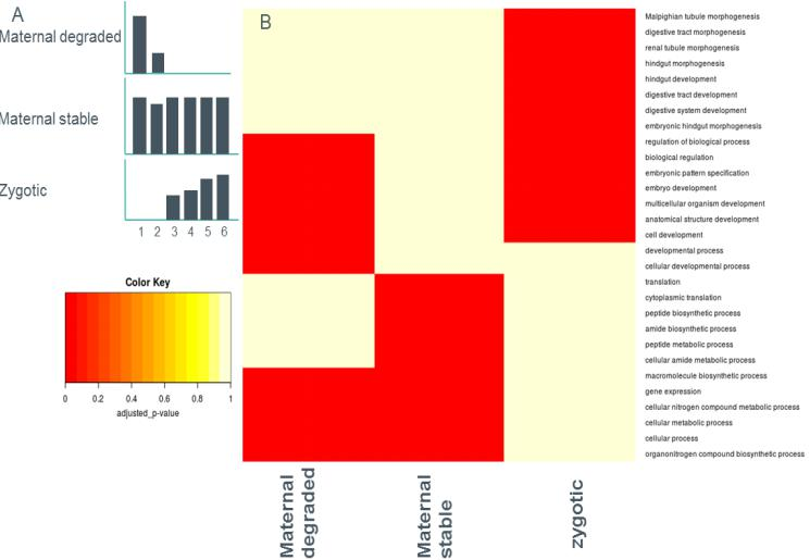 我們對(duì)3個(gè)類別基因集進(jìn)行富集分析;母體降解基因,受精卵基因和母體穩(wěn)定/上調(diào)基因。母體降解基因也是1hpo中表達(dá)高的基因,富含細(xì)胞過程,發(fā)育和新陳代謝(圖6)。母體降解的基因也富含轉(zhuǎn)錄因子,例如DREF,BEAF-32A,PNR,它們是相應(yīng)的果蠅同源基因。類似母體降解基因,母體穩(wěn)定/上調(diào)基因在翻譯,生物合成過程,基因表達(dá),代謝過程等方面得到豐富,反映了快速生長(zhǎng)胚胎的高代謝活性,DREF轉(zhuǎn)錄因子也在這些基因中富集。受精卵基因富含特定的組織形成和發(fā)展過程,包括:后腸發(fā)育,模式規(guī)范,消化道形態(tài)發(fā)生等功能。