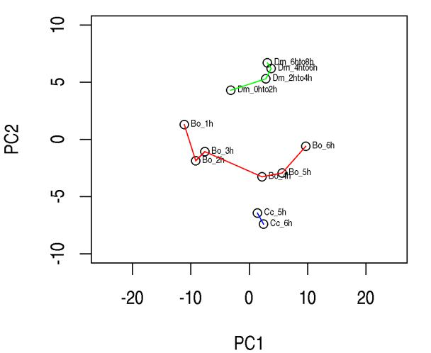 進(jìn)一步尋求確定觀察到的表達(dá)模式是否可以在不同的生物樣品組中重復(fù)并使用實(shí)時(shí)定量PCR(qPCR),這是當(dāng)前用于量化基因表達(dá)的標(biāo)準(zhǔn)方法。然而,qPCR基因表達(dá)的相對(duì)方法需要鑒定內(nèi)參基因其表達(dá)在樣品間保持穩(wěn)定。使用作者的數(shù)據(jù)來確定這些常見內(nèi)參基因以及GAPDH的表達(dá)水平的變化,評(píng)估了3個(gè)基因的qPCR表達(dá);SRY,HID和LINGERER,用RPL19和14-3-3zeta作為內(nèi)參基因,在不同的生物重復(fù)樣品組中(跳過6小時(shí)時(shí)間點(diǎn))。我們觀察到類似的基因表達(dá)趨勢(shì)(特別是14-3-3zeta與RPL19相比)。為了進(jìn)一步探索表達(dá)譜,我使用差異表達(dá)的明顯的基因進(jìn)行主成分分析(PCA)和層次聚類分析,第一個(gè)主成分將前3個(gè)時(shí)間點(diǎn)與最后3個(gè)時(shí)間點(diǎn)分開,分層聚類進(jìn)一步表明前3個(gè)和后3個(gè)時(shí)間點(diǎn)是分別共同聚類的。