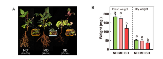 樣品做了三組處理:干旱處理0天(ND stress)、5天(MD stress)和10天(SD stress),并對光合作用進行了檢測,同時檢測了脫落酸(ABA)和生長素(auxin)的含量。