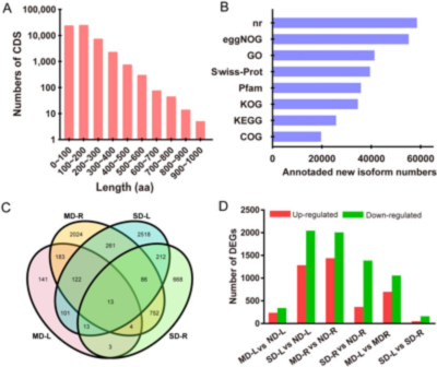 為了闡明干旱響應(yīng)的分子機制,對不同處理植株的葉(L)和根(R)進行了轉(zhuǎn)錄組測序。6個樣本(每個樣本3個生物重復(fù))共18個cDNA文庫,包括ND-L、MD-L、SD-L、ND-R、MD-R和SD-R。從最初的116,192,367 raw reads中,提取了115,374,531 (99.29%) clean reads,組成玫瑰全長非嵌合轉(zhuǎn)錄組。通過與Rosa chinensis 基因組比對,在轉(zhuǎn)錄組中鑒定出了48,549個基因,占基因組長度的21.46%。此外,共鑒定出59,404個開放閱讀框(ORF),如圖2A所示,只有19個編碼序列(CDSs)編碼>800個氨基酸的多肽,而58%的CDSs編碼長度在100 – 400個氨基酸的小肽(圖2A)。最后,89,044個非冗余轉(zhuǎn)錄本中的58,753個可以被注釋到不同的數(shù)據(jù)庫中(圖2B)。