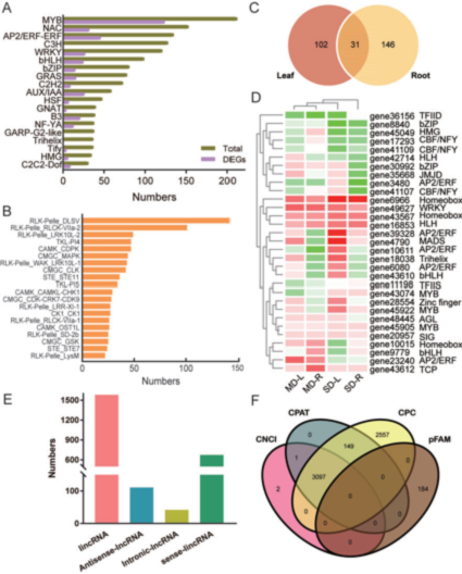 干旱脅迫顯著改變了玫瑰葉片和根中與DEGs相關(guān)的279個轉(zhuǎn)錄因子的表達。MD和SD條件下,MYB、bHLH、b-ZIP、NF-Y、WRKY和AP2家族的TFs顯著富集,其中MYB、AP2和WRKY占主導(dǎo),差異表達的TFs分別為124、46和27個(圖5A)。bHLH和WRKY家族對干旱脅迫的響應(yīng)非常相似。在MD-L處理中,有少量的DEGs、上調(diào)基因,但有大量的下調(diào)基因。相比之下,SD-L處理在這些基因家族中導(dǎo)致了更多的上調(diào)基因,并且適應(yīng)干旱后的葉片和根的干旱響應(yīng)的倍數(shù)變化通常低于SD處理。如圖5C所示,在干旱脅迫下,葉片和根中分別有133和177個TF基因差異表達(圖5 C),其中31個基因是兩個器官共有的且表達模式相似。例如,gene 6966和49627在MD和SD條件下,在葉片和根中都是表達上調(diào)。一些蛋白激酶家族,包括RLK/Pelle_DLSV(142個成員,玫瑰轉(zhuǎn)錄組中較大的家族)和RLK/Pelle_ RLCK -VIIa -2(101個成員)(圖5 B),在玫瑰轉(zhuǎn)錄組中負(fù)責(zé)蛋白激酶的大小。