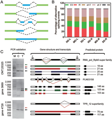 RNA-Seq檢測到的轉(zhuǎn)錄本與R.chinensis ‘Old Blush’基因組進行比對,鑒定剪接異構(gòu)體。如圖7 A所示,我們從非冗余轉(zhuǎn)錄本中檢測到42,544個可變剪接(As),包括12,096個內(nèi)含子保留(IRs)、12,914個選擇性3’剪接位點(alt 3’)、7,433個選擇性5’剪接位點(alt 5’)、9,406個外顯子跳過(ES)和695個互斥外顯子(ME)(圖7 A)。IR在玫瑰葉片中最為常見,在ND-L、MD-L、SD-L和ND-R樣品中的比例分別占34.77%、30.83%、30.1%和29.56%。而在SD脅迫下,ES是主要的AS模式(占所有AS事件的32.16%)。在MD-R中最常見的AS事件是alt 3’ (32.38%), ME(1.75%)是最罕見的(圖7 B)。為了進一步驗證新發(fā)現(xiàn)的轉(zhuǎn)錄組剪接異構(gòu)體,我們隨機選擇了三個至少注釋到兩個異構(gòu)體上的基因(ONT.25325、gene 3669和gene 4728)進行RT- PCR驗證。在這些基因的第一個外顯子和最后一個外顯子或適當(dāng)區(qū)域設(shè)計引物。如圖7 C所示,片段的條帶大小與轉(zhuǎn)錄組數(shù)據(jù)中發(fā)現(xiàn)的剪接亞型的條帶大小一致。對推測的剪接異構(gòu)體進行克隆、測序和比對,以驗證剪接連接。例如,ONT. 25325編碼了一個putative protein,呈現(xiàn)出4個剪接亞型(圖7C),并隨后得到證實。此外,gene 3669和gene 4728顯示出相同的剪接變異。此外,一些剪接異構(gòu)體,如gene 3669,在對照和干旱脅迫下表現(xiàn)出差異。新的可變剪接體的鑒定進一步注釋了R.chinensis ‘Old Blush’基因組。