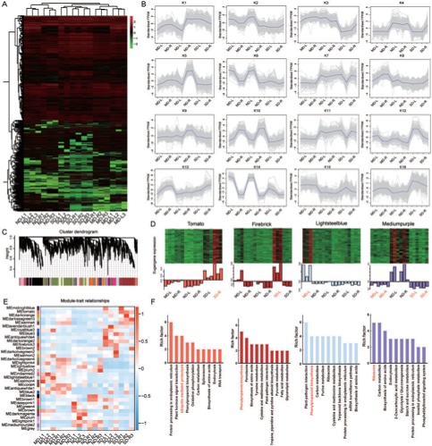 接下來,根據(jù)RNA-seq數(shù)據(jù)鑒定了7101個DEGs,占本研究鑒定的所有基因的14.63% (7,101/48,549)。這些DEGs的熱圖表現(xiàn)出兩個保守組,如在干旱脅迫下誘導(dǎo)和抑制根和葉的表達模式(圖6 A)。然后使用K-means算法進行富集分析,得到16個聚類(K1-K16)(圖6 B)。在SD條件下,K12、K13和K16基因主要在葉片和根中表達,表明它們可能參與干旱脅迫。而在MD和SD處理下,K4、K5、K7、K9和K11基因在根和葉中均受到抑制。