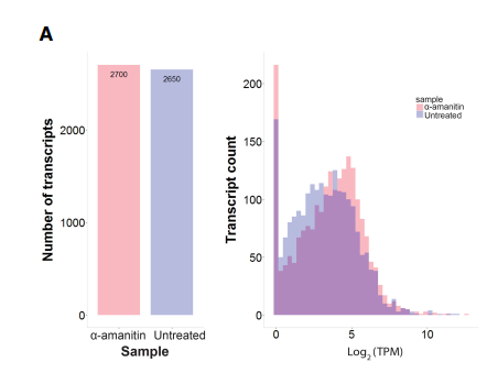 為了對新發(fā)現(xiàn)的轉(zhuǎn)錄本進行分析,文章將短讀長轉(zhuǎn)錄組中的數(shù)據(jù)比對到加入了全長轉(zhuǎn) 錄組的參考基因組數(shù)據(jù)庫,發(fā)現(xiàn)在未經(jīng)處理和α-amanitin 處理的樣品中通過全長轉(zhuǎn)錄組發(fā) 現(xiàn)的超過 2000 個主要不重疊的新轉(zhuǎn)錄本中分別有 89%和 86%有轉(zhuǎn)錄組數(shù)據(jù)支持。并且發(fā) 現(xiàn),在高表達的基因中,短讀長轉(zhuǎn)錄組數(shù)據(jù)的外顯子比對率從從 68%提高到了到 85%。通 過 CPAT 對新發(fā)現(xiàn)轉(zhuǎn)錄本進行編碼潛能預(yù)測,在 4205 個新型轉(zhuǎn)錄本中,3255 個序列具有高 編碼潛力的,使用 Pfam 的驗證結(jié)果也基本類似。利用這些數(shù)據(jù)我們鑒定到了一個 H2AFX 新 的轉(zhuǎn)錄本僅在處理后的樣本中出現(xiàn),HIST2H2BE 基因的新鑒定到的轉(zhuǎn)錄本僅在未處理的贗本中出現(xiàn)。