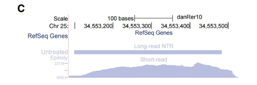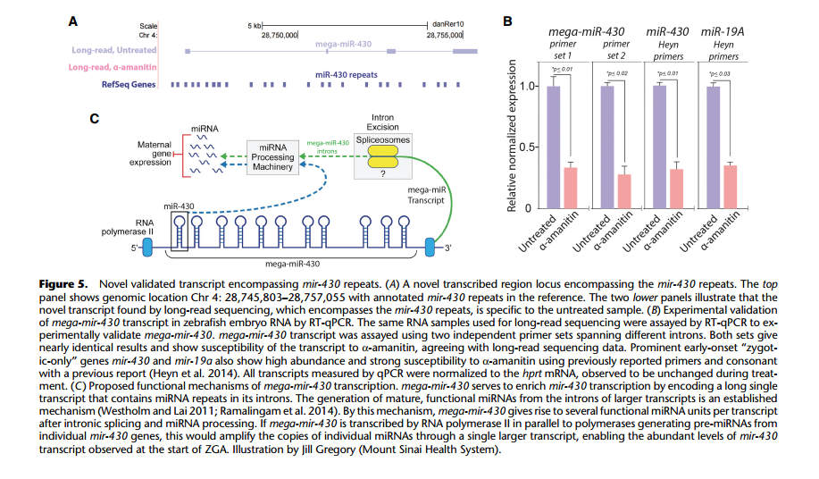 通過全長轉(zhuǎn)錄組鑒定到的大量新轉(zhuǎn)錄本中包括了一種重要 miRNA- miR-430,mir-430 可能是第一個表達的合子基因,它通過對所有母源轉(zhuǎn)錄基因進行的特異性沉默和降解將合子 基因的啟動和母體程序的消除連接起來。在以前的研究中,對其功能研究較多,而對于 miR-430 的來源研究較少。作者鑒定到了一個新的跨越 9kb 基因組序列的四外顯子轉(zhuǎn)錄本, 該轉(zhuǎn)錄本重疊 22 個 mir-430 重復(fù)序列,被稱為“mega-mir-430”。 在α-amanitin 處理中沒 有檢測到 mega-mir-430,并通過 qPCR 進行了驗證,推斷它來源于合子基因組。從每個 mega-mir-430 轉(zhuǎn)錄本產(chǎn)生多個 mir-430 的拷貝,這個發(fā)現(xiàn)解釋了合子基因激活時 mir-430 高表達的原因。