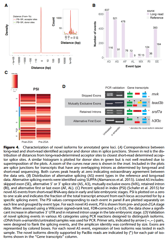 作者接著對全長轉(zhuǎn)錄組對已注釋基因鑒定到的未記錄的轉(zhuǎn)錄本的可變剪切形式的研究。 由于斑馬魚參考基因組對可變剪切的注釋較少,文章使用短讀長的轉(zhuǎn)錄組數(shù)據(jù)對可變剪切位 點進行驗證。作者使用 STAR 軟件分析轉(zhuǎn)錄組數(shù)據(jù),預(yù)測了 3000 個可變剪切位點,其中 99% 可以與全長轉(zhuǎn)錄本數(shù)據(jù)吻合。剪接位點的這種近乎完美的一致性支持證明了全長轉(zhuǎn)錄組鑒定 的外顯子 – 內(nèi)含子邊界的準確性,并強烈支持新檢測到的可變剪接形式的有效性。通過全 長轉(zhuǎn)錄組共發(fā)現(xiàn)了 2000 種新型可變剪切類型,其中已注釋基因的新型可變剪切共 1835 中, 平均每個基因的可變剪切類型提升 50%。