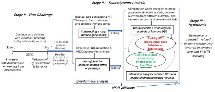 鯉魚皰疹病毒-3(CyHV-3)感染是鯉魚養(yǎng)殖的主要威脅,可導致鯉魚大量的死亡。CyHV-3可通過削弱宿主的免疫系統(tǒng)而使其死亡,導致其對病原微生物易感性,并可能在感染后6至10天內(nèi)出現(xiàn)發(fā)病和死亡。感染CyHV-3后存活下來的鯉魚可以抵抗這種病毒未來的感染。由于CyHV-3在鯉魚中存在潛伏期和持續(xù)性攜帶期,遺傳背景對于了解對病毒的耐藥性至關重要。德國鏡鯉品系G4是中國廣泛栽培的鯉魚品系,但因CyHV-3病毒引起高死亡率。然而目前在研究抗CyHV-3免疫機制的詳細免疫系統(tǒng)網(wǎng)絡方面,還缺乏系統(tǒng)的研究。最近的研究表明,lncRNAs在不同類型病原體感染時的廣泛差異表達,表明lncRNAs在魚類免疫反應中起著關鍵作用。然而,在CyHV-3感染期間,鯉魚體內(nèi)的特異性LncRNA對免疫反應的調(diào)節(jié)尚未被研究。第三代測序(如PacBio)可以解碼比第二代測序方法(如Illumina)更長的基因序列,包括mRNA和非編碼RNA在內(nèi)的更高質(zhì)量的轉(zhuǎn)錄本組裝,可能提供對遺傳抗性機制的更詳細理解。在本研究中,為了揭示鯉魚抗CyHV3育種中涉及的免疫機制,使用圖1所示的策略,對CyHV-3激發(fā)期間的mRNA和長非編碼RNA(lncRNA)進行了整合轉(zhuǎn)錄組學分析。對來自繁殖品系或非繁殖品系的存活鯉魚和健康對照鯉魚的免疫相關轉(zhuǎn)錄本進行了分析。