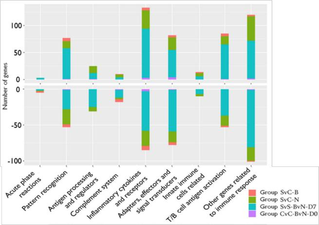 在CyHV-3感染后第0天和第7天提取鯉魚頭腎組織,并通過Illumina和PacBio測序分析轉(zhuǎn)錄組。在對涉及的GOterm和KEGG途徑進行分析。加權基因共表達網(wǎng)絡分析用于揭示lncRNA對免疫基因的調(diào)節(jié)。結(jié)果表明,繁殖鯉魚品系通過一種特定的先天免疫機制對CyHV-3感染產(chǎn)生了顯著的抗性,主要的生物學過程是自噬、吞噬、細胞毒性和凝集素和MUC3阻斷病毒。此外,還有免疫抑制信號途徑,如IL21R對STAT3的抑制,PI3K介導的感染時多巴胺對炎癥的抑制,以及NLRC3在穩(wěn)定狀態(tài)下對STING的抑制。從非抗性品系中還發(fā)現(xiàn)了CyHV-3的可能易感因素,如ITGB1、TLR18和CCL4。本研究結(jié)果還表明,LncRNA調(diào)節(jié)的Nramp和PAI分別促進病毒感染和感染細胞的增殖,而T細胞白血病同源框3(TLX3),以及l(fā)ncRNA的半乳糖凝集素3可能在抗病制中發(fā)揮作用。因此,免疫遺傳不敏感或易受CyHV-3感染的免疫因子已被揭示。