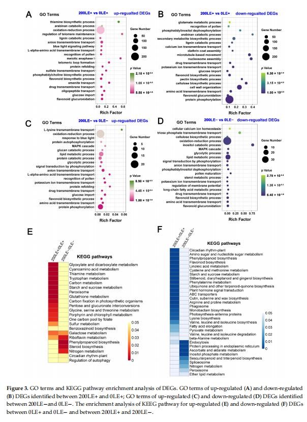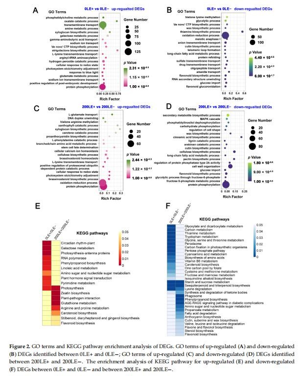 E.gansuensis上調(diào)1269個基因,下調(diào)1195個0LE+基因(葉E+植物在0mMNaCl下)與0LE-(E-植物在0mMNaCl下的葉子)相比。類似地,E.gansuensis誘導(dǎo)844個基因并抑制200LE+(E+植物的葉子)的973個基因在200mMNaCl下)與200LE-(E-植物的葉子在200mMNaCl下)相比(圖1)。目前的結(jié)果表明在NaCl脅迫下E.gansuensis對基因的調(diào)控有巨大的影響與200mMNaCl相比。對0LE+和0LE-之間的DEGs進(jìn)行GO富集分析發(fā)現(xiàn),E.gansuensis主要誘導(dǎo)“鈉離子跨膜轉(zhuǎn)運(yùn)”、“胚胎后發(fā)育的正調(diào)控”、“蛋白質(zhì)磷酸化”、“光系統(tǒng)化學(xué)計量調(diào)整”和“谷氨酸代謝過程”(圖2A)。此外,GO富集分析表明,類別“類黃酮葡萄糖醛酸化”、“類黃酮生物合成過程”、“氧化-還原”過程”和“陰離子跨膜轉(zhuǎn)運(yùn)”在下調(diào)中富集E.gansuensis在0mMNaCl濃度下的DEGs(圖2B)。這些結(jié)果暗示E.gansuensis重新編排了植物生理學(xué)和重要生物學(xué)的許多方面提高寄主植物的競爭力。GO富集分析在200LE+和200LE?之間的DEGs表明,E.gansuensis主要誘導(dǎo)“蛋白質(zhì)磷酸化”、“氧化還原過程”、“油菜素類固醇生物合成過程”、“細(xì)胞鈣離子穩(wěn)態(tài)”和“L-谷氨酸轉(zhuǎn)運(yùn)”(圖2C);此外,GO富集分析發(fā)現(xiàn)“蛋白質(zhì)磷酸化”的類別,“果糖6-磷酸代謝過程”、“類黃酮生物合成過程”和“MAPK”在200mMNaCl濃度下,E.gansuensis在下調(diào)的DEG中富集級聯(lián)”(圖2D)。我們的研究結(jié)果表明,E.gansuensis通過激活細(xì)胞信號轉(zhuǎn)導(dǎo)促進(jìn)宿主在脅迫環(huán)境下的生長,維持平衡。促進(jìn)ROS、Ca2+信號和油菜素類固醇(BR)的生物合成,它們在抗壓過程中起作用。