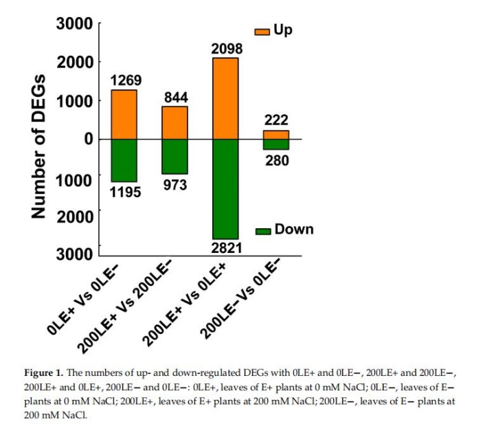 進(jìn)一步闡明E.gansuensis在NaCl脅迫下對寄主植物生長的分子機(jī)制,E+和E-A.inebrians葉片(28天齡)的轉(zhuǎn)錄組通過Illumina測序進(jìn)行分析。E+A.inebrians和E-A.inebrians用含0mMNaCl和200mMNaCl濃度處理。閾值FDR≤0.01和FC≥2用于確定DEG(差異表達(dá)基因)。結(jié)果顯示響應(yīng)E.gansuensis的轉(zhuǎn)錄本發(fā)生顯著變化,在0mMNaCl和200mMNaCl濃度下的分別發(fā)生2464和1817DEGs(圖1)。此外,在NaCl脅迫下,轉(zhuǎn)錄本發(fā)生了顯著變化,E+葉子的4919個DEG。然而,一個小的轉(zhuǎn)錄組變化發(fā)生在對NaCl脅迫的響應(yīng),E-葉為502DEG(圖1)。