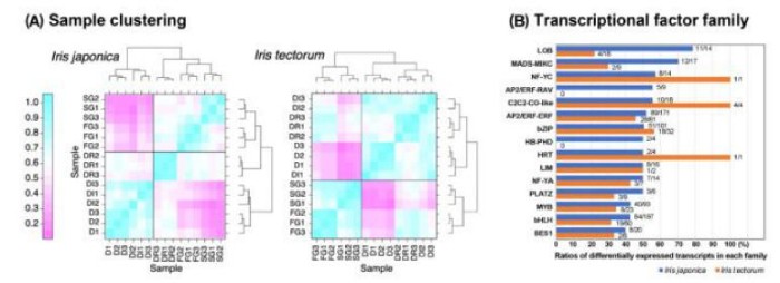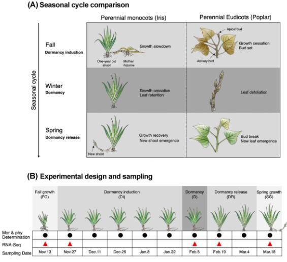 冬季休眠是植物應(yīng)對(duì)潛在致命環(huán)境的最關(guān)鍵策略。近幾十年來,由于氣候的變化,在經(jīng)濟(jì)上具有重要意義的多年生雙子葉植物中的這一過程得到了廣泛的研究。然而,在不需要冷卻的常綠單子葉植物中,休眠過程至今仍是一個(gè)謎。因此,揭示這些單子葉植物越冬休眠的調(diào)控機(jī)制,不僅有助于更好地開發(fā)利用植物資源,而且對(duì)應(yīng)對(duì)全球變暖帶來的低溫不足的挑戰(zhàn)具有重要意義。通過多年物候觀測(cè)發(fā)現(xiàn),鳶尾和蝴蝶花越冬休眠過程均僅有生態(tài)休眠,將休眠植株移至適宜條件下能迅速恢復(fù)生長,且在同一栽培地區(qū)二者越冬休眠期存在明顯差異,是研究多年生單子葉植物越冬休眠機(jī)理的理想材料。本研究比較了鳶尾(I.tectorum)和蝴蝶花(I.japonica)在關(guān)鍵發(fā)育時(shí)間點(diǎn)的休眠過程。這兩種鳶尾都表現(xiàn)出短暫的休眠過程,且持續(xù)時(shí)間不同,在溫暖條件下都能很容易地恢復(fù)生長。為了破譯轉(zhuǎn)錄變化,作者對(duì)鳶尾進(jìn)行了全長測(cè)序,對(duì)蝴蝶花進(jìn)行了RNA-seq測(cè)序,分別生成參考轉(zhuǎn)錄組,揭示了調(diào)控常綠與落葉類鳶尾越冬休眠的分子機(jī)制。