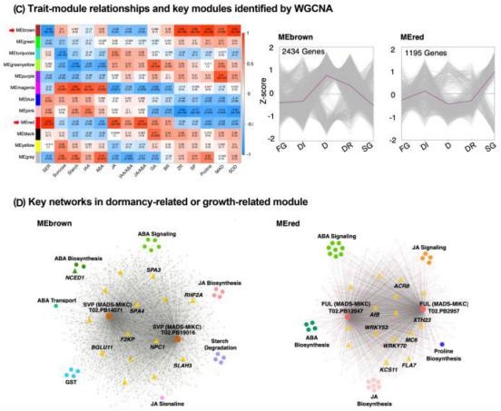 為了了解基因和通路的動(dòng)態(tài)變化,并識(shí)別鳶尾越冬性休眠過程中的休眠相關(guān)模塊,我們對(duì)IJ的所有15118個(gè)差異轉(zhuǎn)錄本進(jìn)行了WGCNA分析,共鑒定出12個(gè)共表達(dá)模塊.對(duì)每個(gè)模塊進(jìn)行了主要的表達(dá)趨勢(shì)和KEGG富集分析。并進(jìn)行模塊-形狀關(guān)聯(lián)分析,選擇形狀特異性模塊和階段特異性模塊。結(jié)果中找到分別與冬季生長率呈顯著正、負(fù)相關(guān)的生長模塊(red)和休眠模塊(brown),MADS-box家族基因FUL/AP1和SVP分別位于兩個(gè)模塊,并與植物激素合成與信號(hào)轉(zhuǎn)導(dǎo)、碳水化合物代謝和環(huán)境響應(yīng)通路基因共表達(dá)。