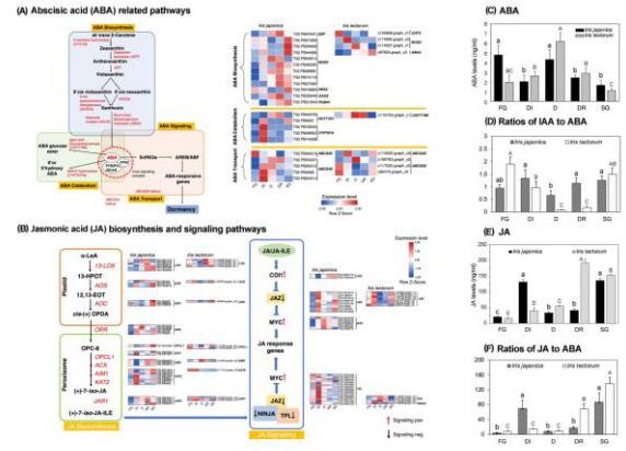 為了進(jìn)一步解剖鳶尾越冬休眠所必需的基因和通路,我們對(duì)基因表達(dá)譜和相關(guān)生理特征進(jìn)行了更詳細(xì)的研究。結(jié)果表明,脫落酸水平在D期升高了兩倍以上,并與SER呈顯著負(fù)相關(guān),表明脫落酸在鳶尾越冬休眠中的保守作用。脫落酸生物合成和分解代謝的穩(wěn)態(tài)jing q調(diào)控植物中的脫落酸水平。相比之下,IJ中參與脫落酸生物合成的差異轉(zhuǎn)錄本在DI過程中保持較低的表達(dá)水平。因此,作者推斷IJ中脫落酸水平的降低比IT中保證了更長的營養(yǎng)生長周期。推測(cè)這可能是由于脫落酸生物合成的抑制和分解代謝的活躍所致。