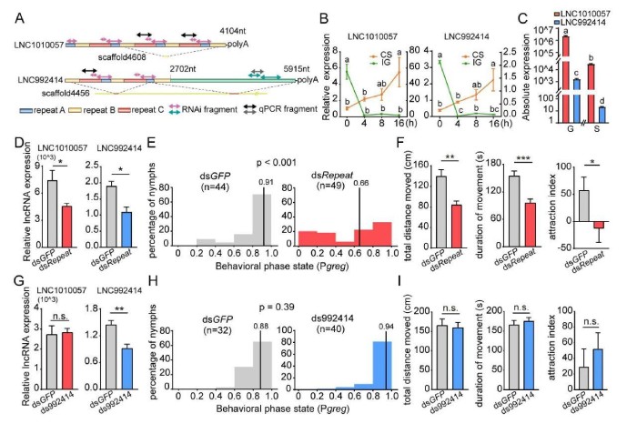 為為了驗證LNC1010057和LNC992414在蝗蟲型變中的功能,進行了一系列分子生物學(xué)實驗。首先,克隆了在LNC1010057和LNC992414基因座中鑒定出的長的轉(zhuǎn)錄本。LNC1010057由重復(fù)的A、B和C元素組成,這些元素依次分布并重復(fù)4次,但C元素重復(fù)三次(圖5A)。序列比對證明LNC992414在5’端與LNC1010057共享相似的重復(fù)序列,但是它們是從不同的基因組基因座轉(zhuǎn)錄而來的(圖5A)。盡管LNC992414的定量表達水平可以通過特異性引物檢測,但LNC1010057的表達水平為重復(fù)元件的總表達水平。如預(yù)期的那樣,LNC1010057和LNC992414的表達模式極為相似。在CS期間,兩種lncRNA的表達持續(xù)增加,并且在16h幾乎增加了四倍(圖5B)。在IG期間,4h后表達水平顯著下降,之后保持相對穩(wěn)定(圖5B)。LNC1010057和LNC992414之間的序列結(jié)構(gòu)和表達模式的相似性表明它們是同源的lncRNA。但是,實時qPCR分析表明,在散居型和群居型蝗蟲的大腦中,LNC1010057的表達水平比LNC992414的表達水平高約1000倍(圖5C)。其次,為了測試LNC1010057和LNC992414是否參與蝗蟲型變調(diào)節(jié),在通過RNAi抑制蝗蟲大腦中的表達后進行了行為分析。顯著降低LNC1010057的表達水平(7470對3764610)和LNC992414(1.9vs.1.0)(圖5D)后行為分析表明,群居型蝗蟲其行為顯著改變?yōu)樯⒕訝顟B(tài)(圖5E)。此外,多個與型有關(guān)的行為參數(shù)發(fā)生了變化??傄苿泳嚯x(TDM)和總移動持續(xù)時間(TDMV)顯著降低(圖5F),但是,移動速度沒有區(qū)別。同時群居蝗蟲的特定喜好行為顯著下降(58.3對-13.5圖5F)。但LNC992414表達降低并未引起從群居狀態(tài)到散居狀態(tài)的轉(zhuǎn)變(圖5G和H)。與對照相比,與型相關(guān)的行為參數(shù)(包括運動和特定物種的優(yōu)選行為)沒有差異(圖5I)。LNC992414的RNAi實驗不會引起行為變化,因此排除了LNC992414調(diào)節(jié)蝗蟲型變的可能性。這些結(jié)果表明是LNC1010057而不是LNC992414潛在地調(diào)節(jié)了蝗蟲的型變。