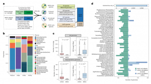 進(jìn)一步深入探索了可用的高質(zhì)量基因組中編碼的代謝潛力。分析了 UHGG 和 IMGG 數(shù)據(jù)集中的高連續(xù)性和高質(zhì)量基因組。共從15512個(gè)基因組中還原了97428個(gè)MGC區(qū)域,其中78675個(gè)是完整的,并被納入進(jìn)一步分析。這些完整的MGC屬于所有八個(gè)MGC類別,分布在58個(gè)MGC類型中。*常見的類別是SCFA(40.0%),其次是Putative(28.9%)和E-MGC(17.2%)。然后,門水平分布和聚類分析揭示了MGC類別的總體分布在門水平的顯著差異(圖4a),以及在十個(gè)主要的門之間,它們?cè)诓煌T中的數(shù)量各不同(圖4a)。此外,基于涵蓋九個(gè)主要門的功能性MGC分類分布的特異性聚類表明,MGC概述和組成在門水平間存在顯著差異,這些未培養(yǎng)物種中的一些最近發(fā)現(xiàn)了以前未報(bào)告的Christensenellales和Oscillospirales分類群,突出了這些代表性不足的分類群在促進(jìn)宿主健康方面的潛力(圖4c)。