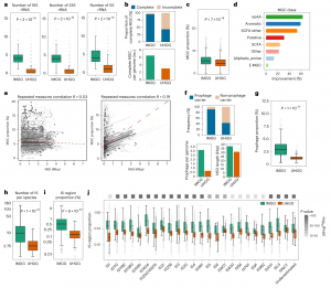 與UHGG數(shù)據(jù)庫相比,IMGG數(shù)據(jù)庫中前噬菌體基因組的分辨率有了很大提升。該方法在95%的IMGG中都能檢測到前噬菌體序列(與UHGG(55%)相比)。IMGG和UHGG每個(gè)基因組編碼前噬菌體的平均數(shù)量分別為4個(gè)和1個(gè)。IMGG中的前噬菌體序列的連續(xù)性也較高,N50長度為37974 bp(UHGG中為31064 bp;圖3f);IMGG中前噬菌體編碼區(qū)的基因組比例是UHGG的4.2倍(圖3g)。與UHGG相比,IMGG中的IS區(qū)域更加jing q,表現(xiàn)在在每個(gè)物種的IS區(qū)域總拷貝數(shù)(增加了三倍;圖3h)和IS編碼區(qū)域的基因組比例(增加了近四倍;圖3i)。IS類別中改善程度*高的是IS1380(與UHGG相比,改善了5.6倍),其次是IS5、IS1634和ISAS1(分別是5.5倍、5.5倍和5.3倍;圖3j)。