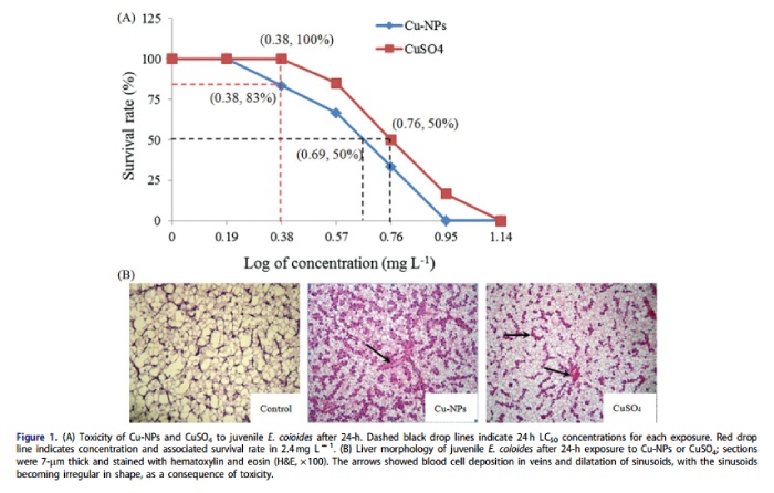 石斑魚(yú)被暴露在不同濃度(1.6,1.6,2.4,3.7,5.8或9.0毫克的cu l 1)的cu-np中。這些濃度是根據(jù)初步實(shí)驗(yàn)選擇確定。在暴露期間,魚(yú)不被喂食,死魚(yú)被移除。急性暴露時(shí)間持續(xù)24小時(shí),并在結(jié)束時(shí)評(píng)估魚(yú)的死亡率。