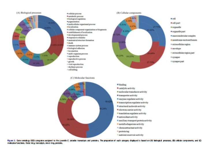 3294個(gè)蛋白及11619轉(zhuǎn)錄本被功能注釋到(圖4)。這些轉(zhuǎn)錄本和蛋白質(zhì)分別分布在25和24個(gè)COG類(lèi)別中,其中“僅一般功能預(yù)測(cè)”是轉(zhuǎn)錄本的較大組(總共1732個(gè))和蛋白質(zhì)(630),之后是“信號(hào)轉(zhuǎn)導(dǎo)機(jī)制”,“翻譯后修飾、蛋白質(zhì)翻轉(zhuǎn)、伴侶”、“功能未知”、“轉(zhuǎn)錄”、“細(xì)胞內(nèi)轉(zhuǎn)運(yùn)、分泌和囊泡轉(zhuǎn)運(yùn)”、“細(xì)胞骨架”和“RNA加工和修飾”。在“脂質(zhì)轉(zhuǎn)運(yùn)和代謝”這類(lèi)中轉(zhuǎn)錄本3.2%(總共372個(gè))和蛋白質(zhì)4.6%(153)