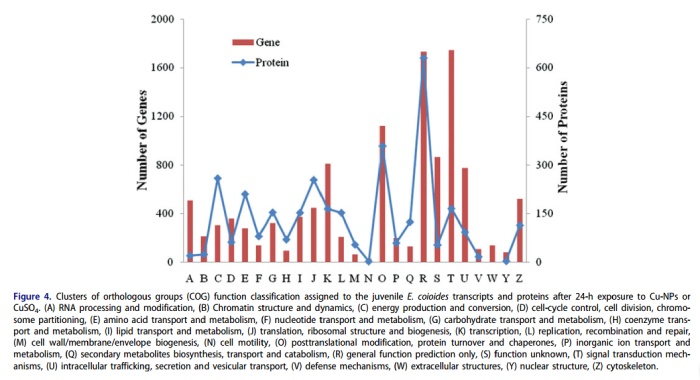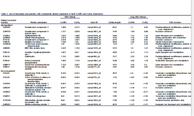 用蛋白質(zhì)組學(xué)分析方法獲得的差異表達(dá)蛋白與mRNA進(jìn)行了比較分析;根據(jù)他們的氨基酸序列來(lái)匹配轉(zhuǎn)錄本,在Cu-NPs組與對(duì)照組及CuSO4和對(duì)照組相比較,分別共140(100%)和352(99.4%)個(gè)差異表達(dá)的蛋白。我們進(jìn)一步確定在兩種銅粒子下蛋白和基因的表達(dá)是否一致,發(fā)現(xiàn)21的轉(zhuǎn)錄和蛋白在同一方向改變(13個(gè)上調(diào),八個(gè)下調(diào))(表2)。有趣的是,大多數(shù)基因(16個(gè)基因)的表達(dá)在Cu-NPS比CuSO4更強(qiáng)烈,但是蛋白質(zhì)卻相反。