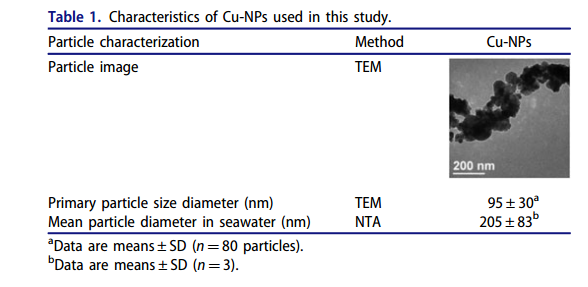 Cu-NPS呈顆粒狀,呈團(tuán)聚狀,海水中的平均粒徑(205±83 nm)大于實(shí)驗(yàn)主要的粒徑(95±30 nm)。(見(jiàn)下表)