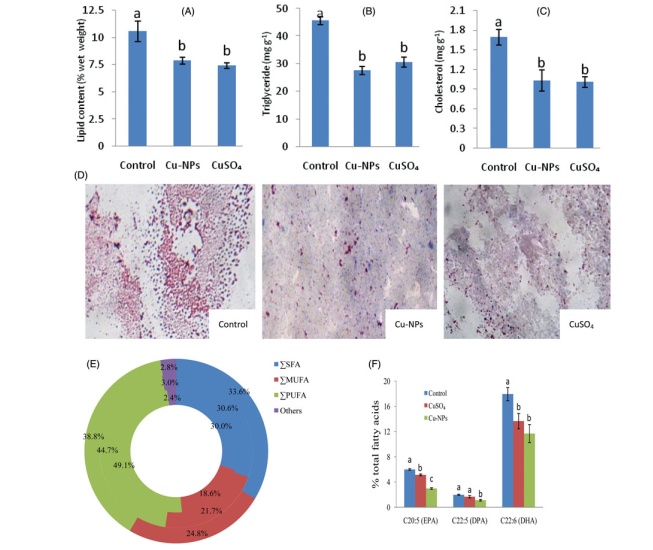 與對(duì)照組相比,在兩種銅形式下,肝臟中脂類(lèi)、甘油三酯和膽固醇含量均顯著降低,但兩種銅形式下相比無(wú)顯著性差異(P>0.05)。正常脂質(zhì)積累(紅色染色表明的脂滴)在對(duì)照組中明顯增加,而Cu-NPS或硫酸銅暴露則減少了脂滴的數(shù)量(圖5(D)),任何一種銅暴露均降低了總多不飽和脂肪酸,但總單不飽和脂肪酸和總飽和脂肪酸(Psfa)較對(duì)照組增加,而在Cu-NPS中,多不飽和脂肪酸(圖5(E))的作用更為明顯(圖5(E))。與對(duì)照相比,cu-nps或硫酸銅暴露后,脂肪酸、二十碳五烯酸(epa,c20:5)、二十二碳六烯酸(dha,c22:6)和二十二碳五烯酸(dpa,c22:5)均下降,而cu-nps中脂肪酸組分的含量比cu-nps明顯增加(圖5(F))。